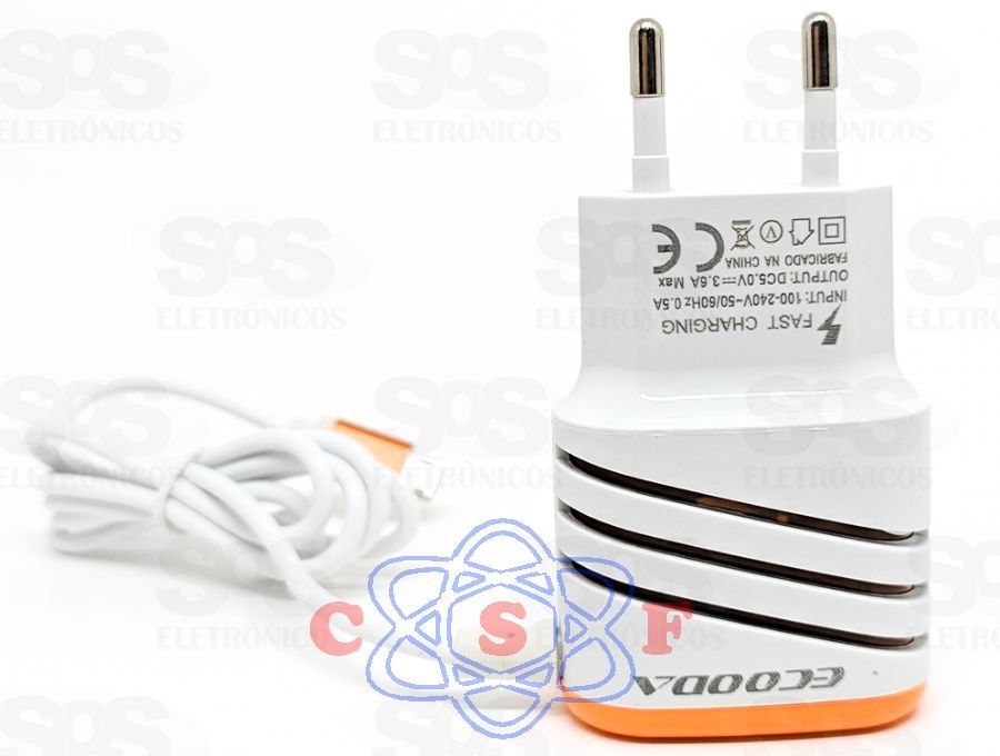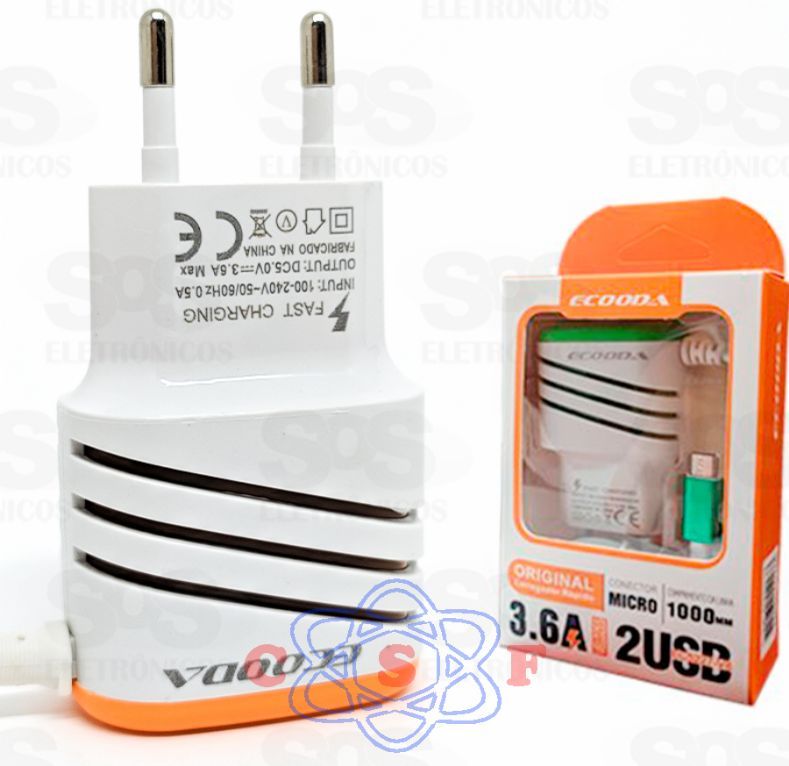 Carregador Ecooda Rápido para Celular 2 X Usb Com Cabo 1 Metro V8 3.6A Original EC5227Descrição
