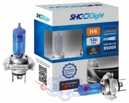 Lâmpada Automotiva Super Branca Shock Light H4 12V 60+55W Marca: SHOCKlight Código de barras: 6949999818514